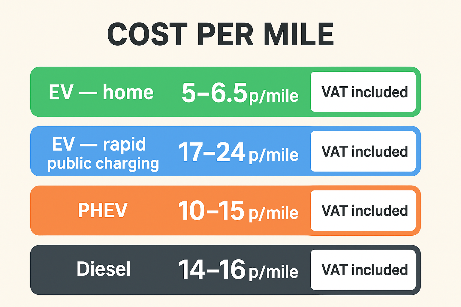 Even with the proposed EV tax added, home-charged EVs remain significantly cheaper to run per mile, while public-charged EVs begin to converge with petrol and diesel costs.